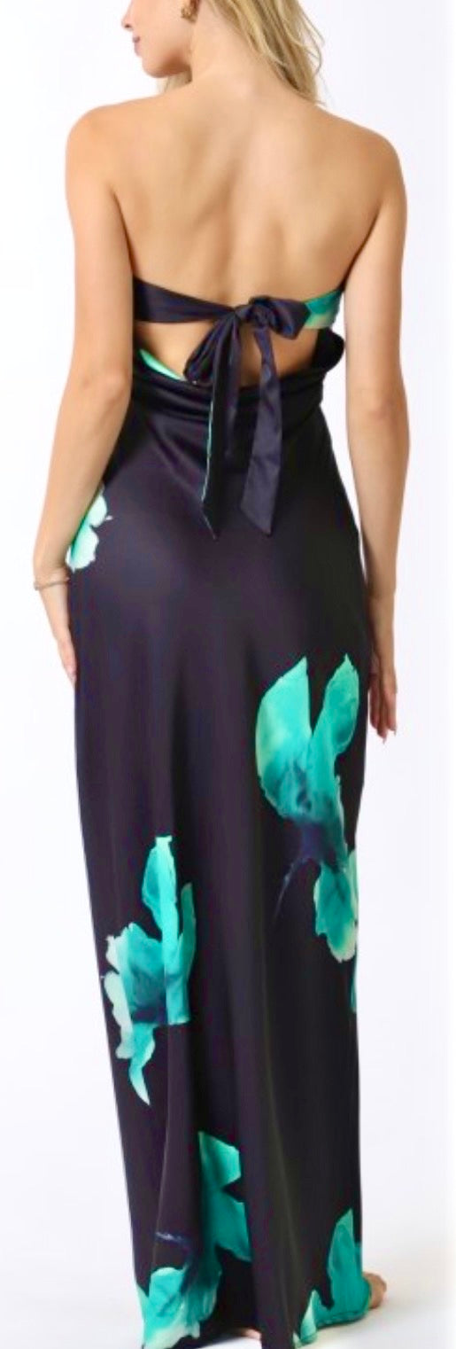 Off shoulder corsage detailed gown with split front. Zip back.