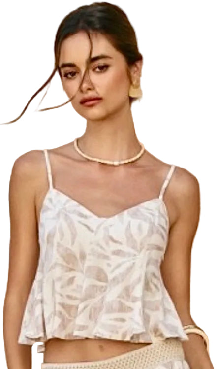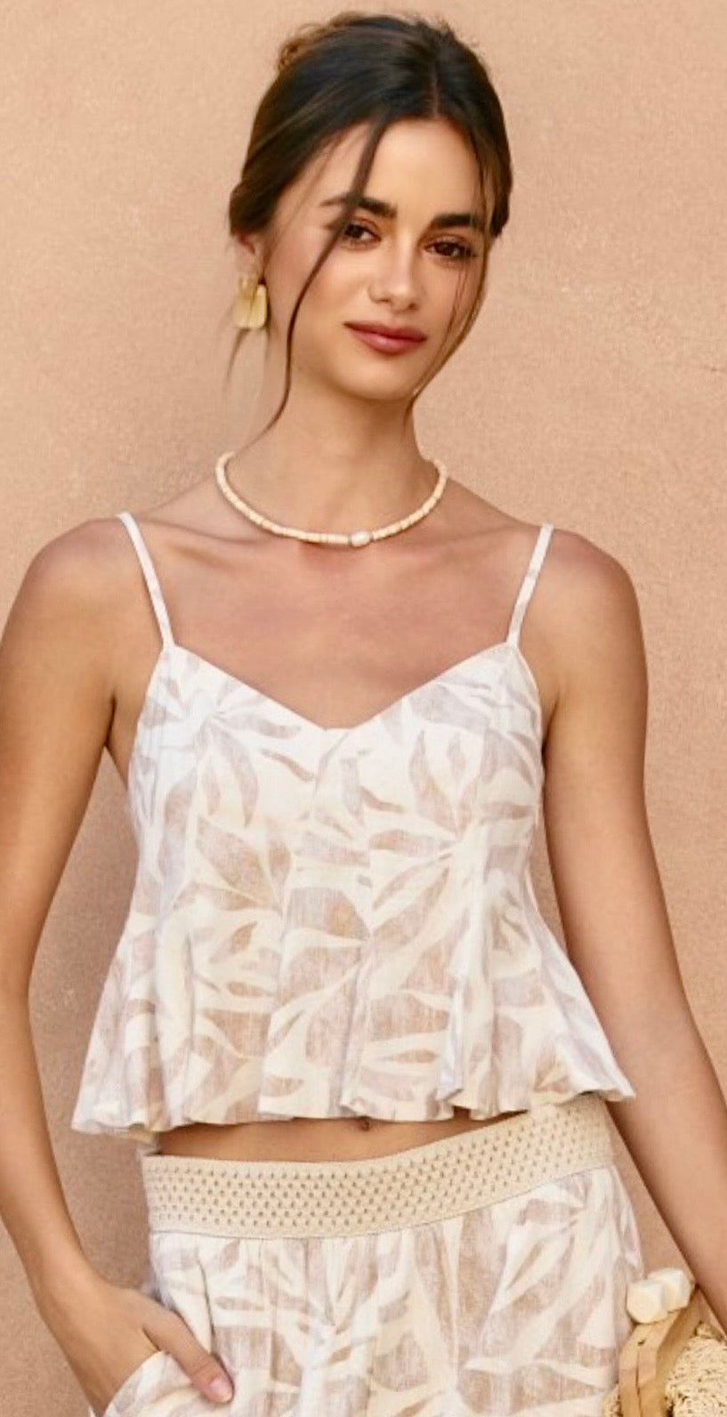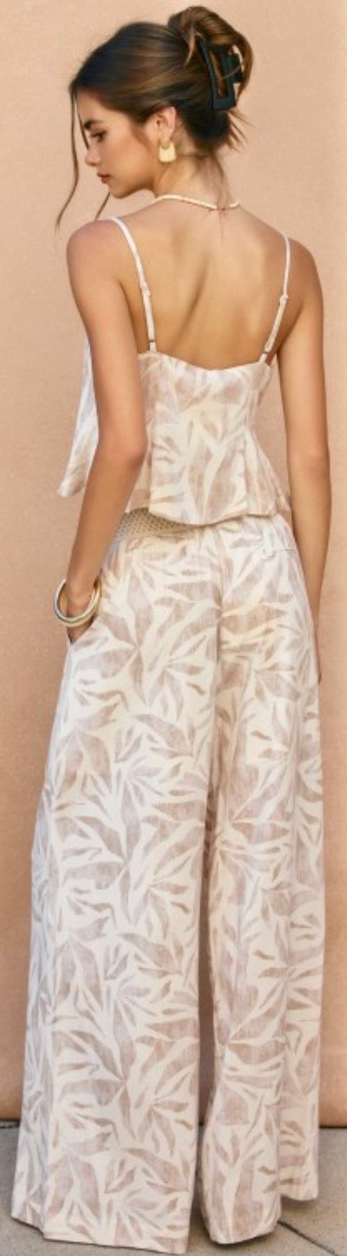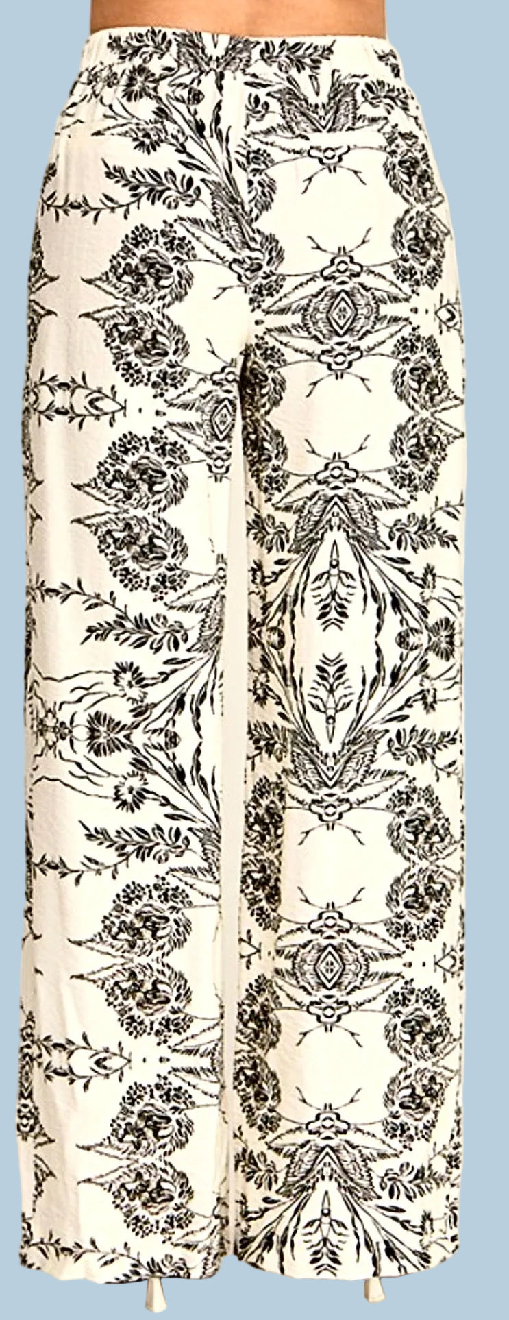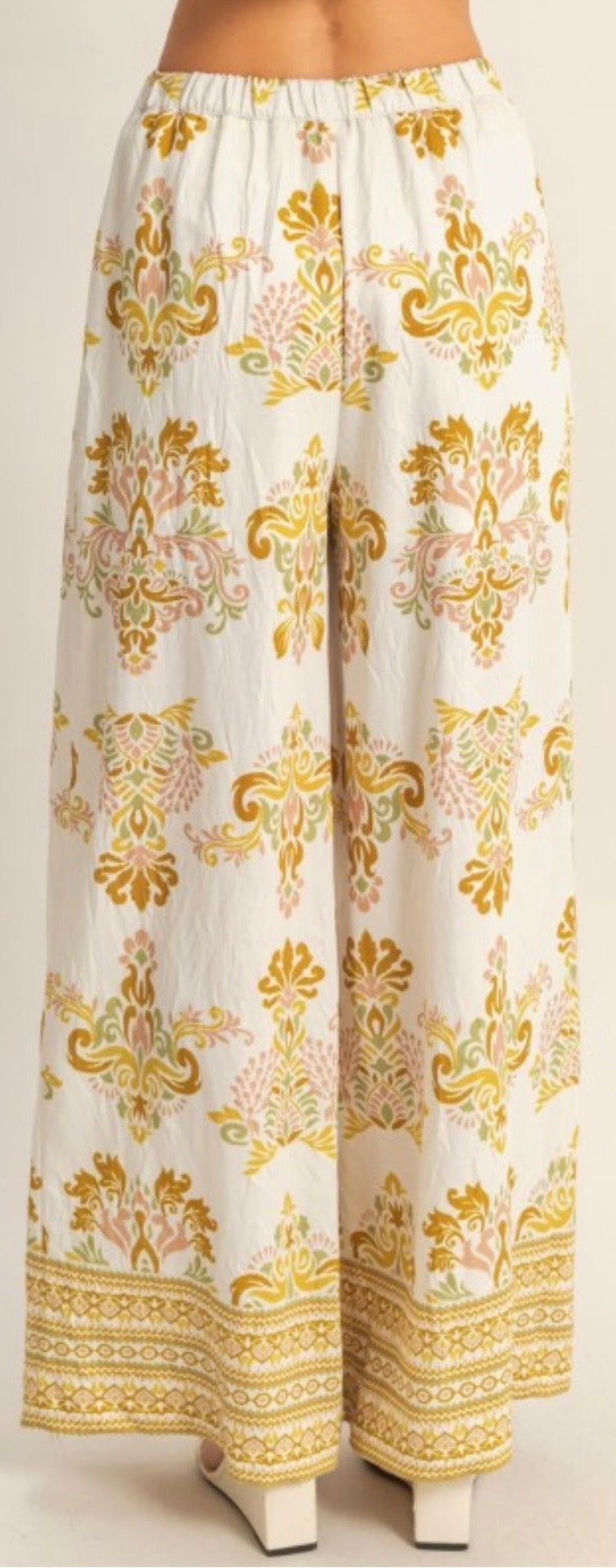 Printed palazzo pant with side pockets. Beaded detail on drawstring.