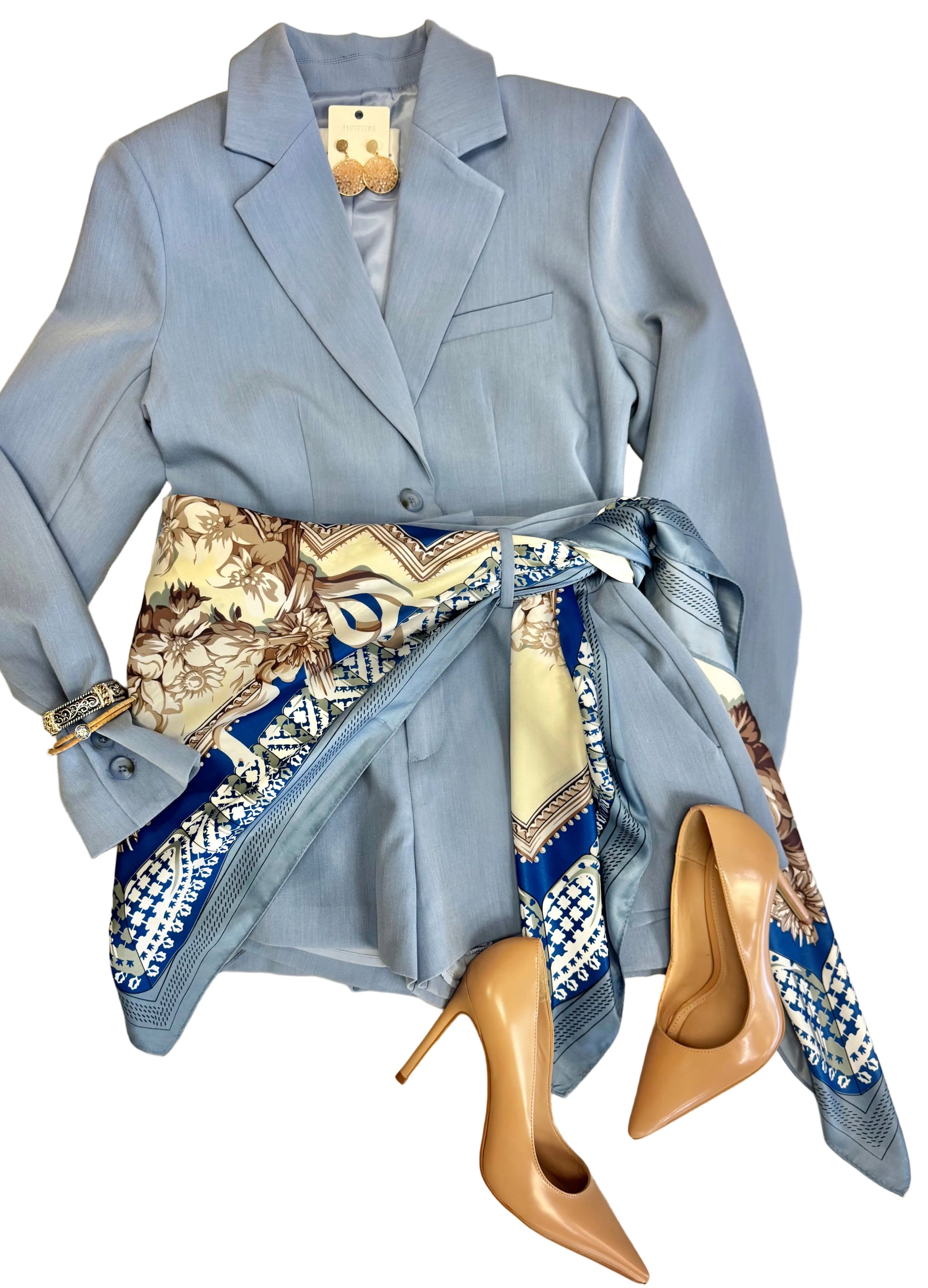 Oversized blazer and matching belted shorts set. Scarf sold separately.