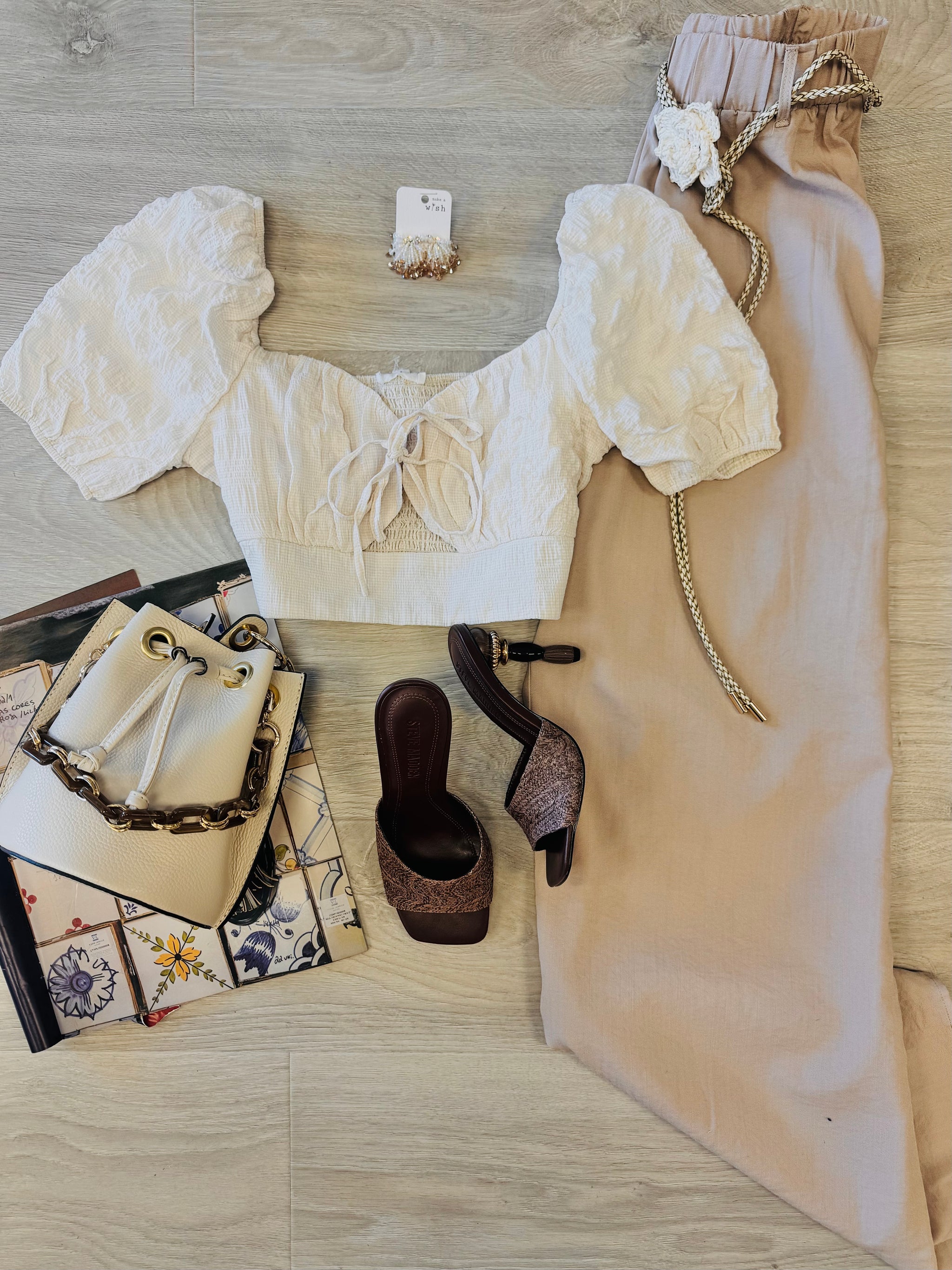 Elastic waisted palazzo pants with unique raffia rosette belt.