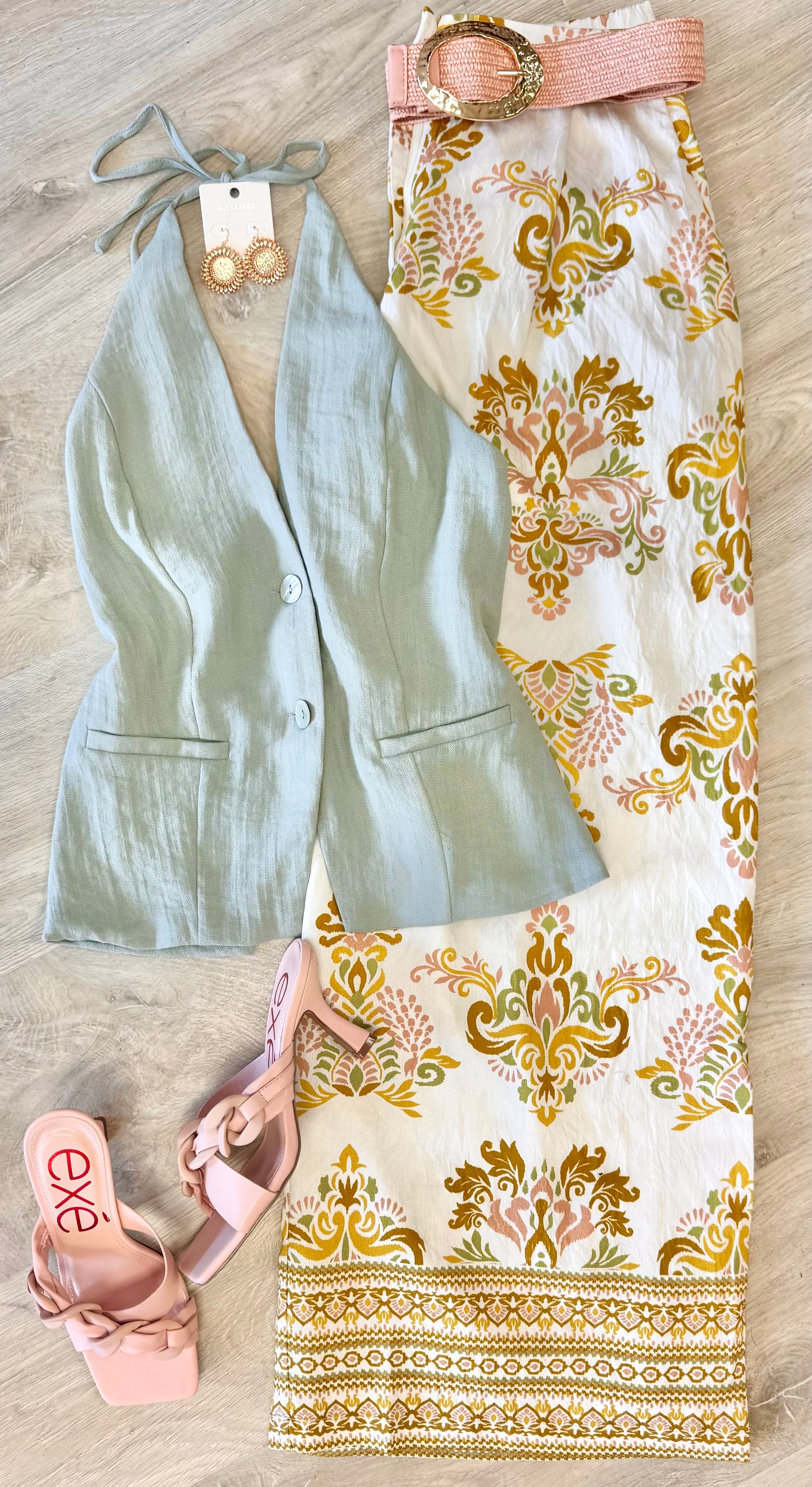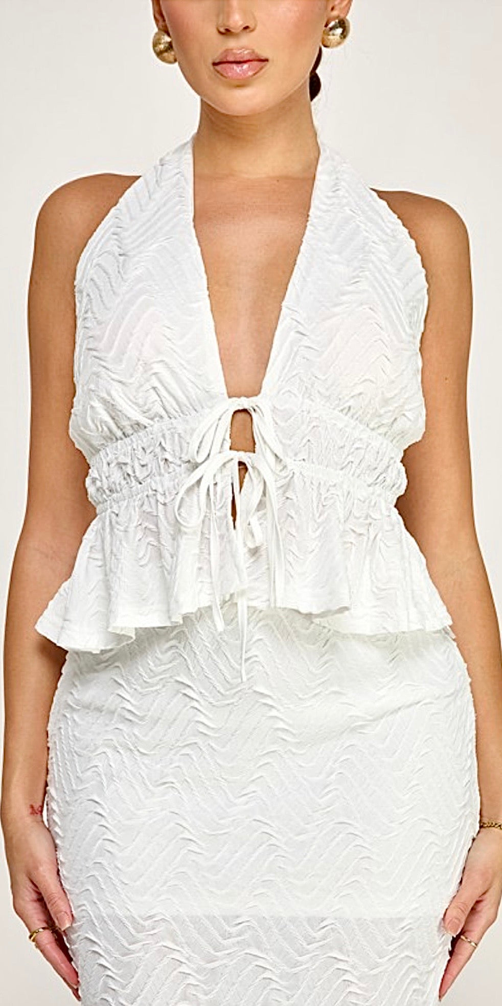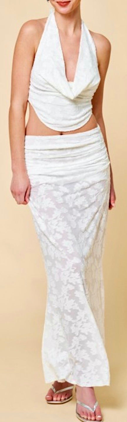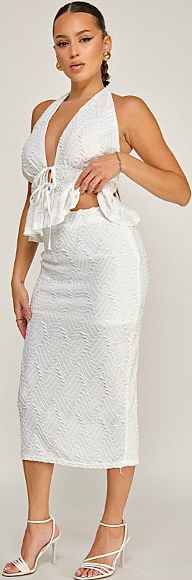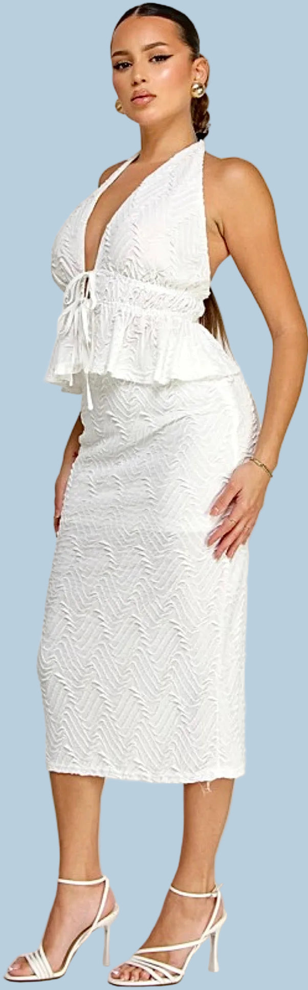 Sultry babydill top with matching fitted midi skirt.