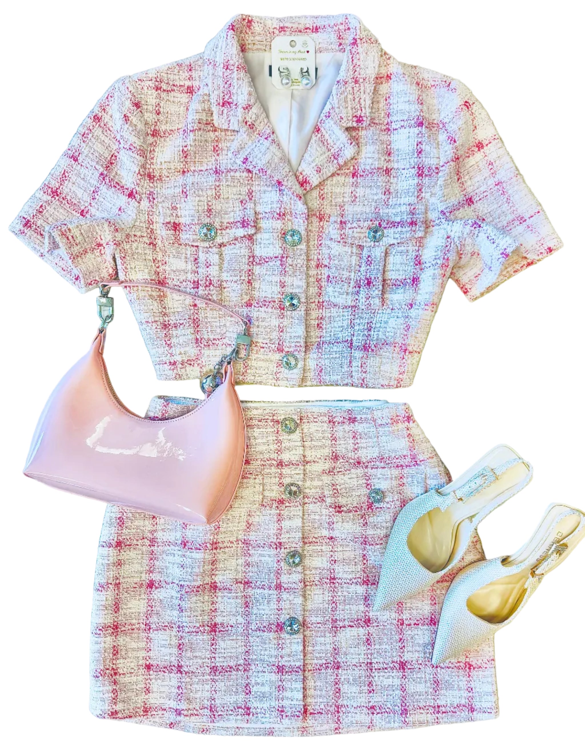 Cropped tweed short sleeve blazer with brilliant rhinestone buttons with matching miniskirt.