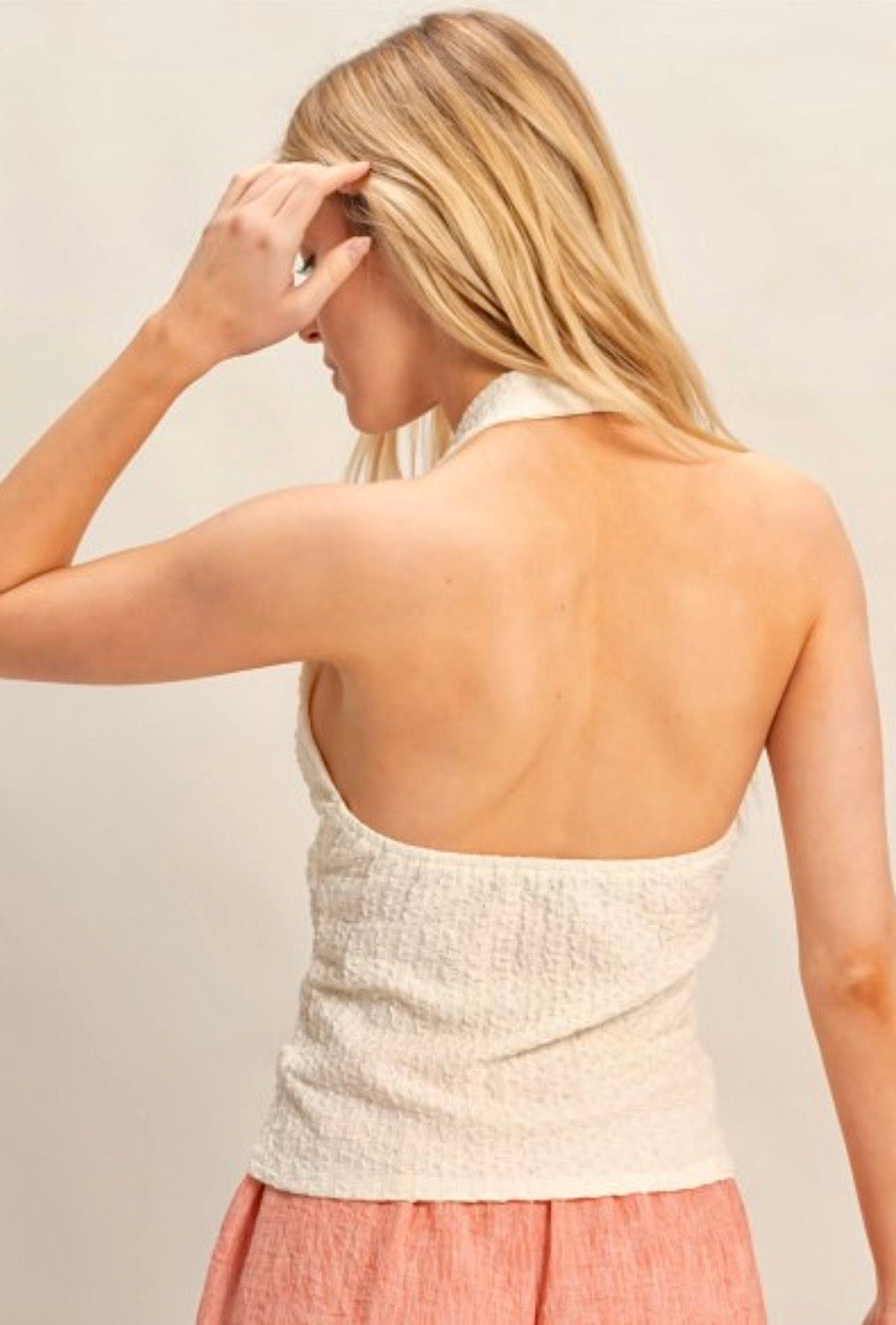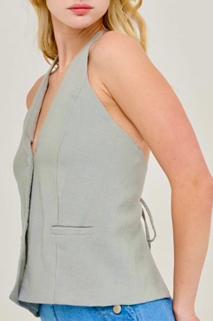 Halter style linen vest with unique tie-back feature.