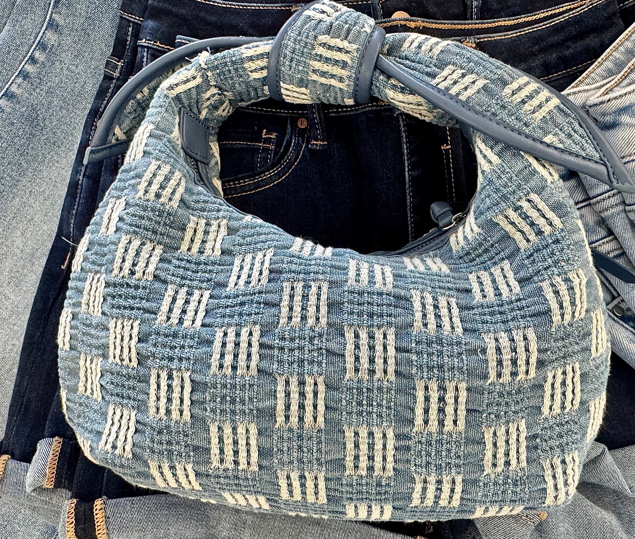 Patterned soft denim hobo bag. Long shoulder strap included.