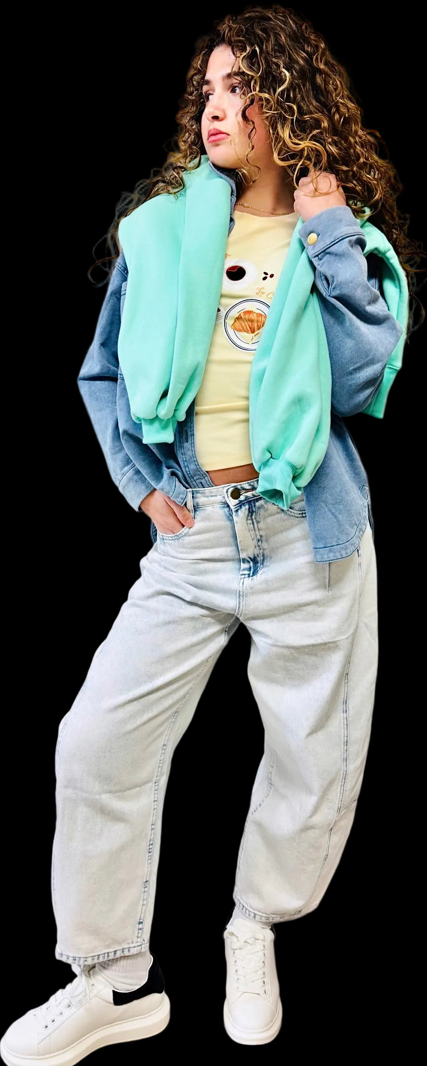 Mid-rise relaxed fit barely denim with unique bleached acid wash and contrasting side patch. 100% cottom