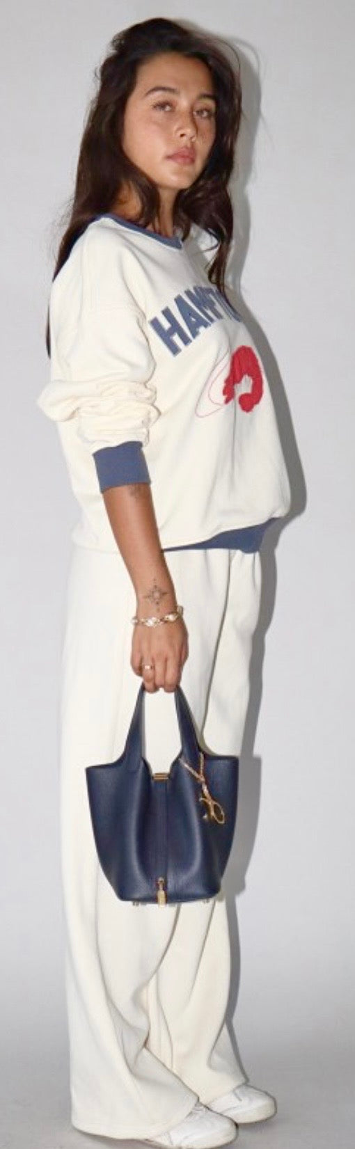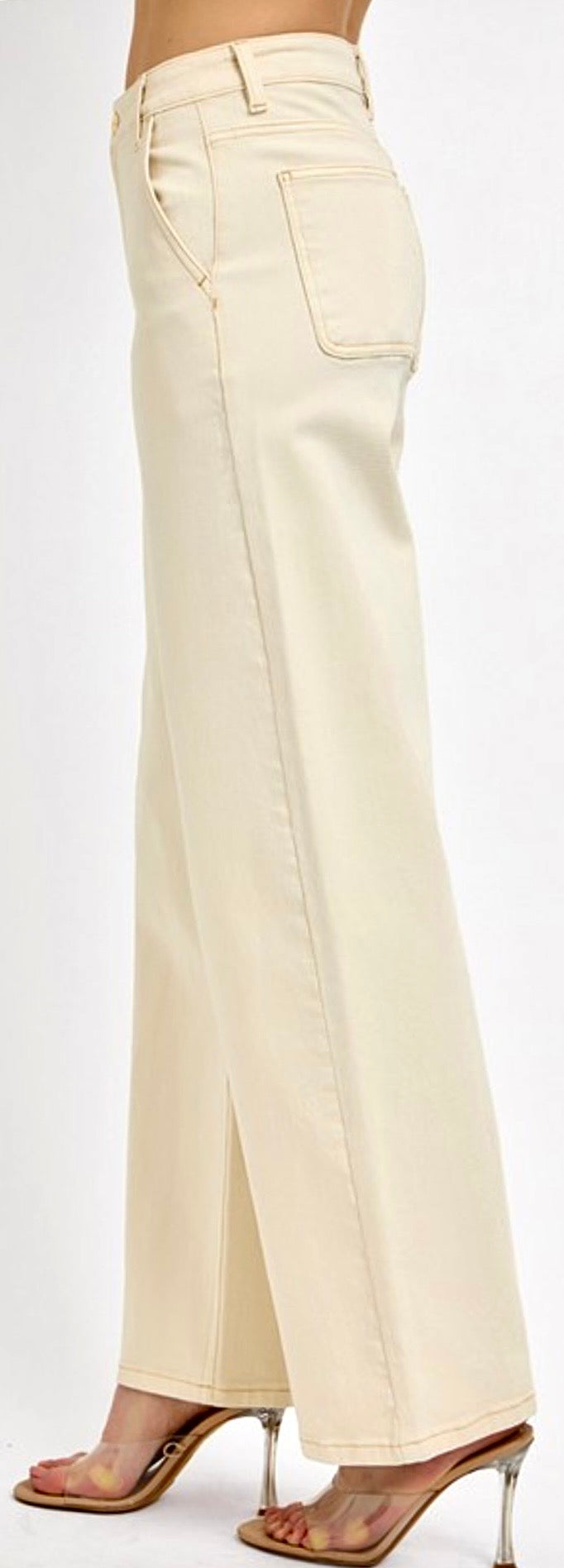 Soft high waisted palazzo pant. Side zip. Half elastic waist.