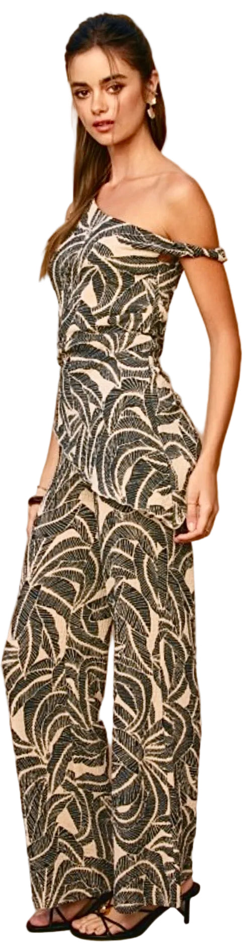 Quality stretch crepe jumpsuit with off shoulder silk scarf attached. Back zip.