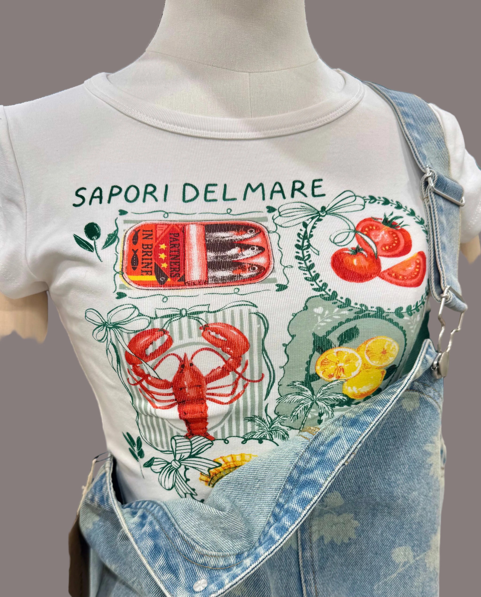 Cropped baby tee with fisherman core graphic. Cotton blend.