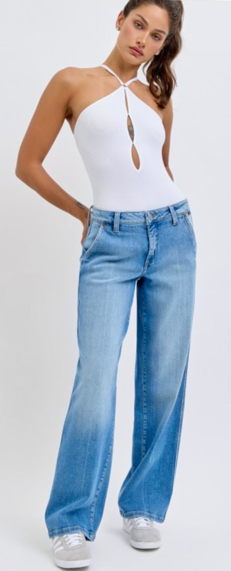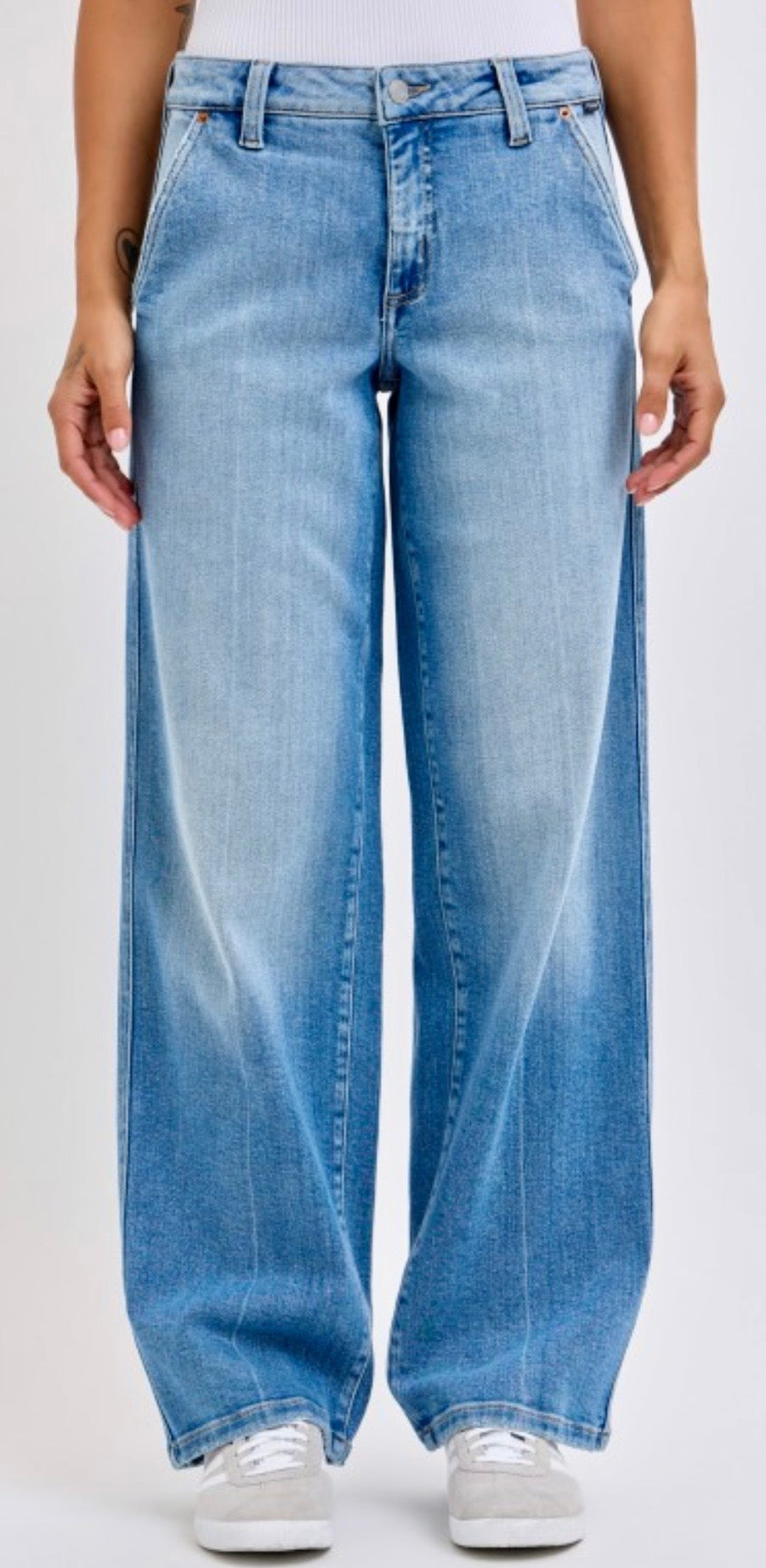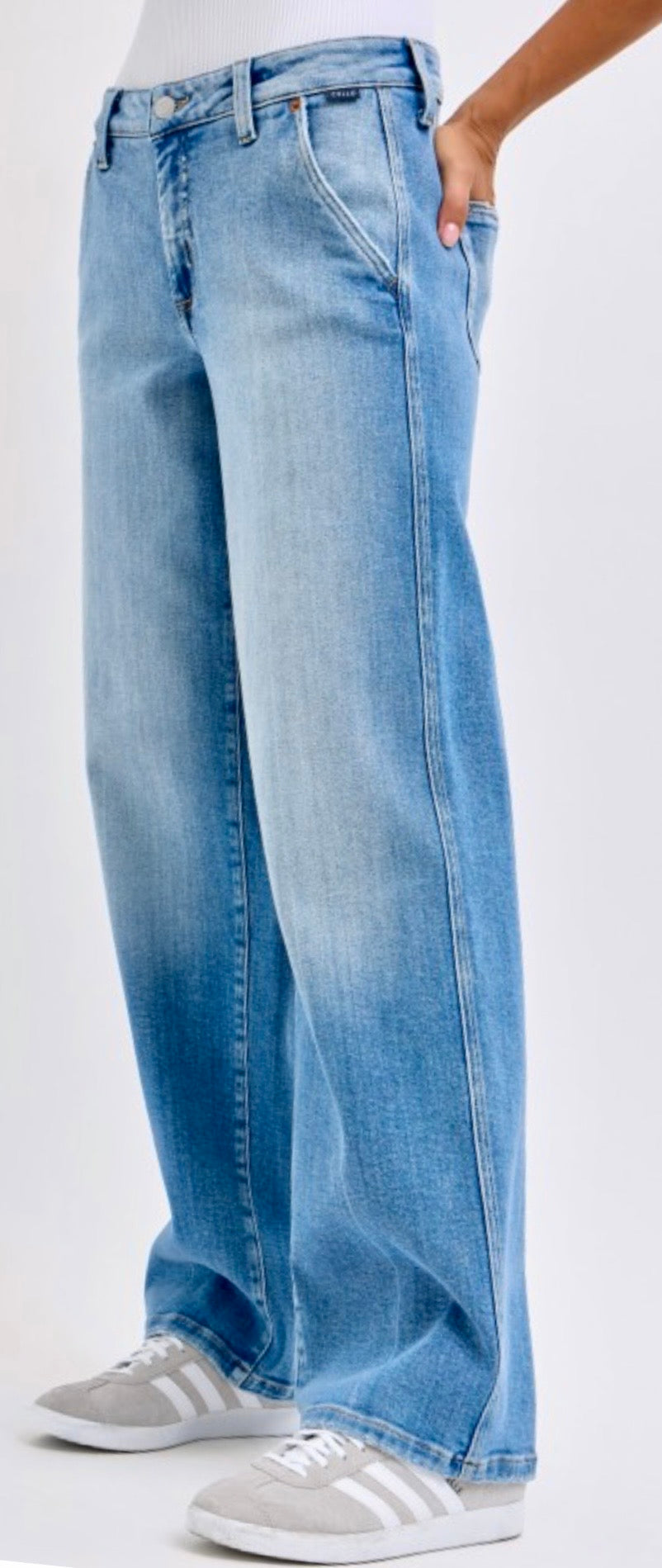 Super cute baggy denim with slanted side pockets. Awesome added stretch for comfortable fit.