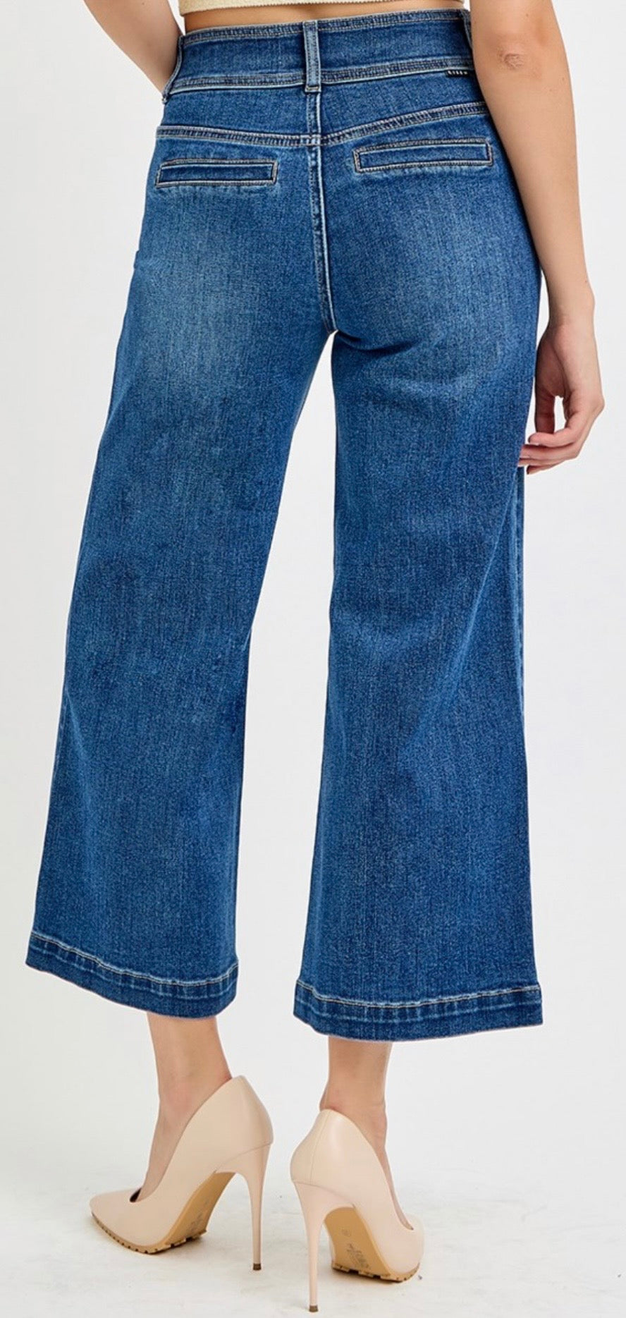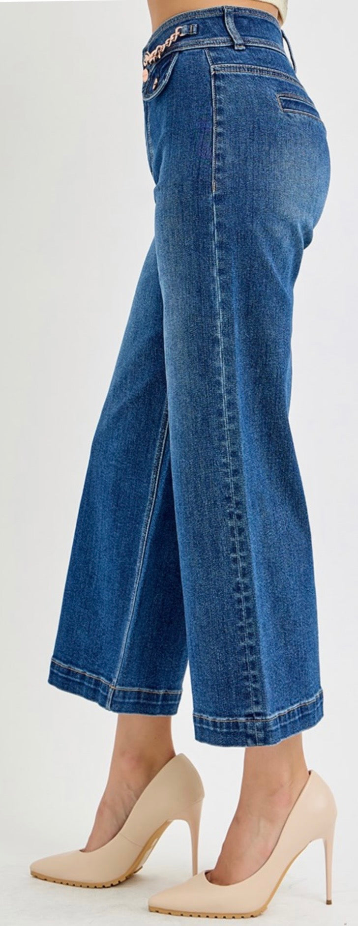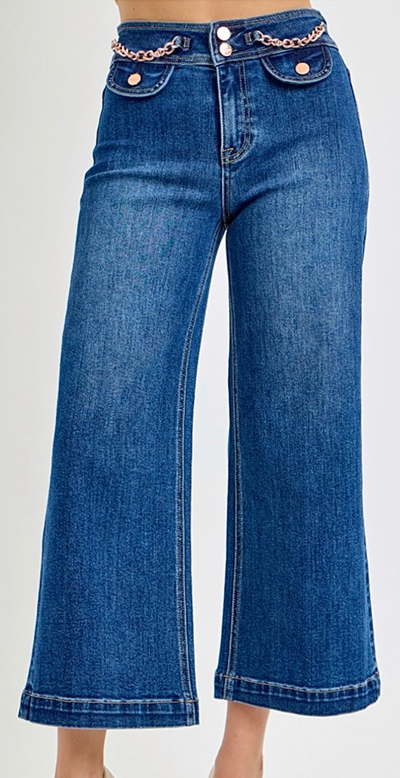 High-rise cropped wide leg denim with unique gold finished jewel details. Made with stretch for...