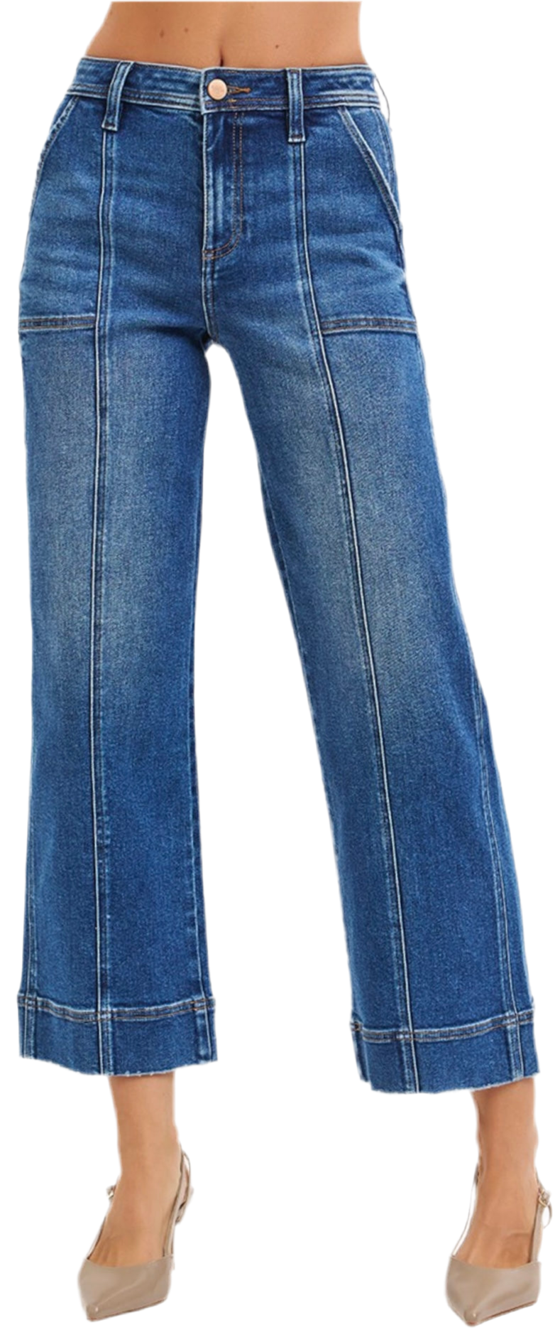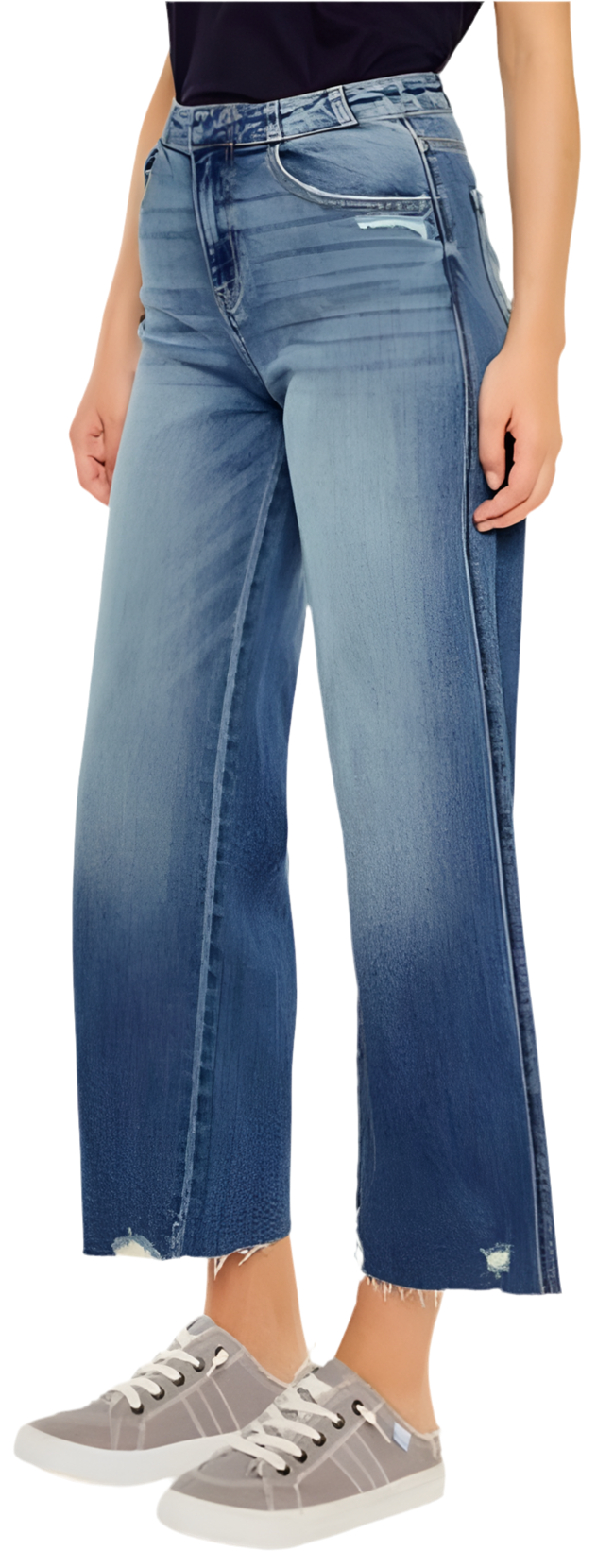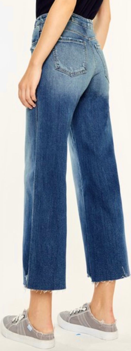 Trendy wide leg denim with raw hemline. Omitted belt loops with hidden button closure. Added...