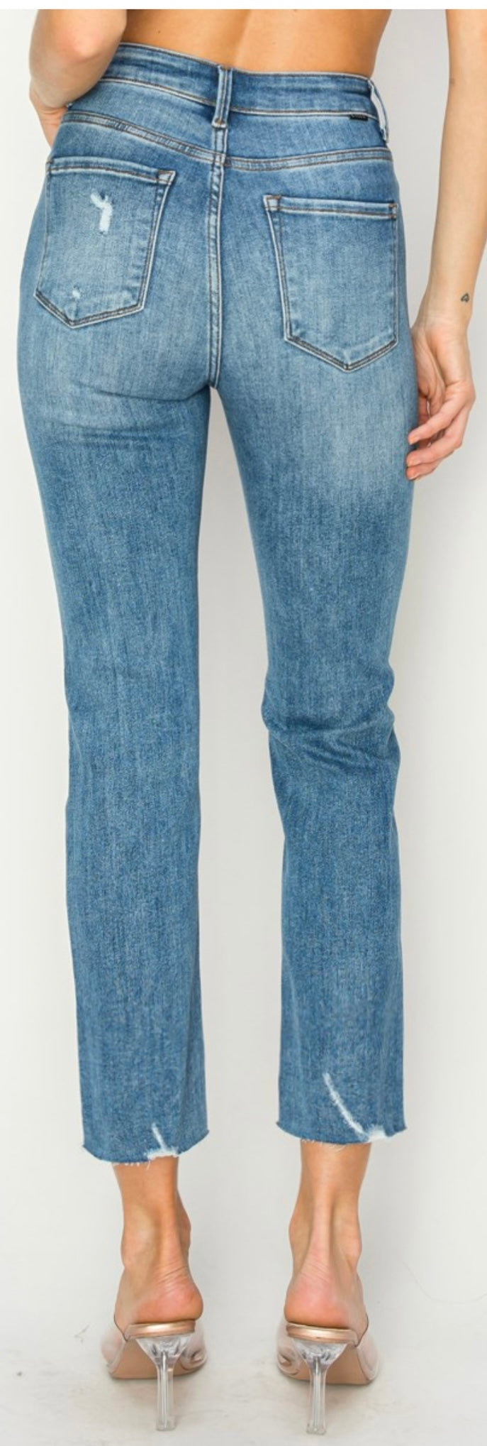 High rise bootcut denim with stretch added for optimal comfort and fit. Frayed hemline.