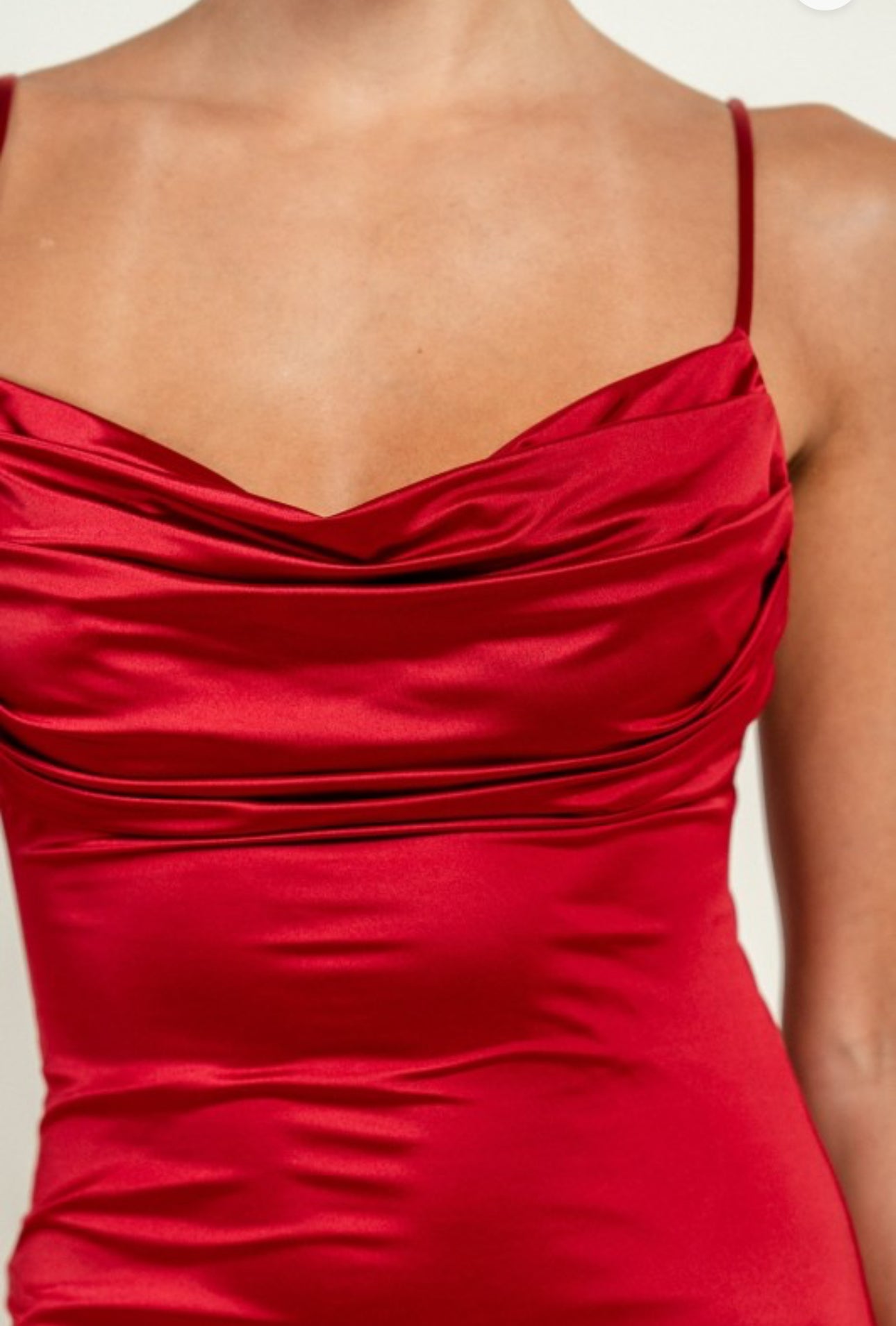 Unique shiny stretch fabric creates a perfect silhouette with front and back ruching.