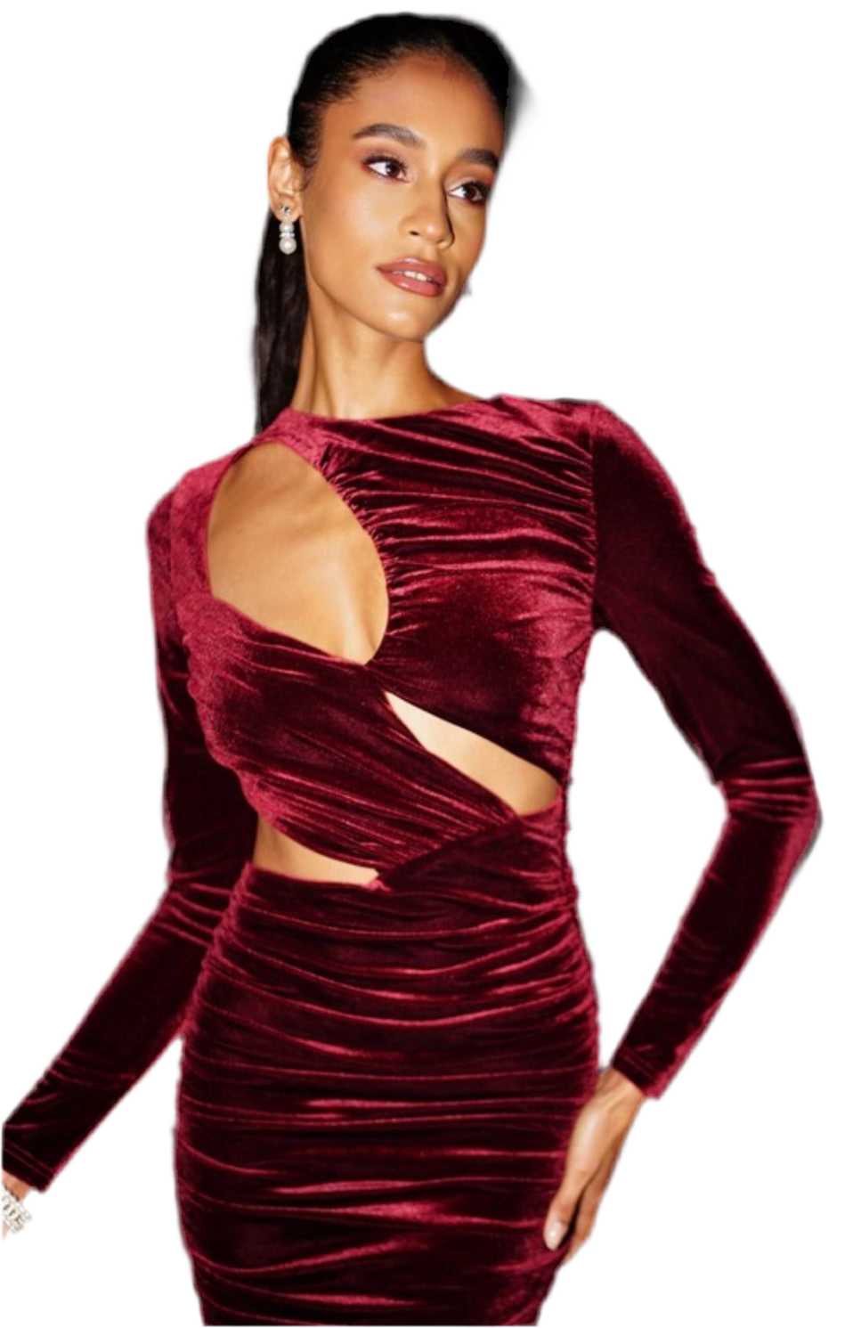 Plush velvet ruched dress with sexy front cut outs. Back zip.