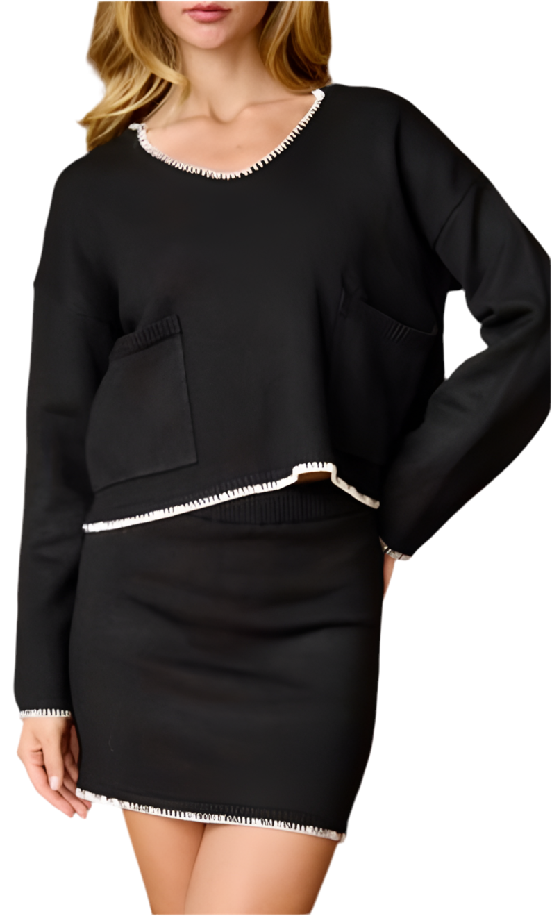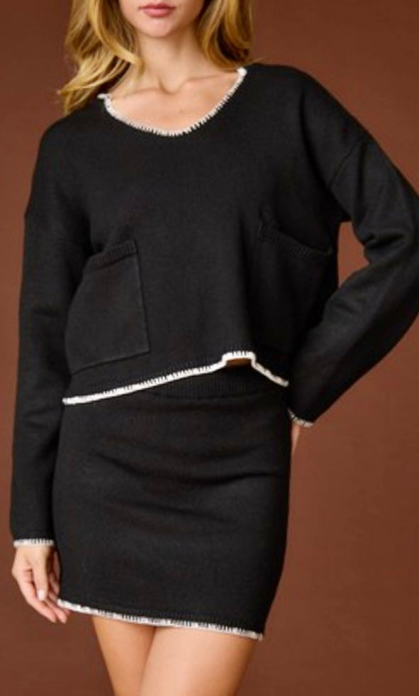 Whipstitch trimmed mini skirt and relaxed sweater set.