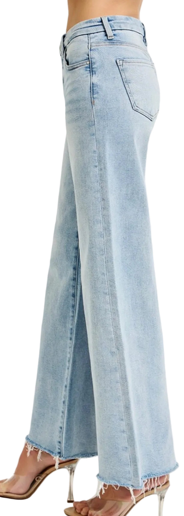 Classic 5 pocket high rise wide leg denim. Added stretch for comfort. Raw hemline.