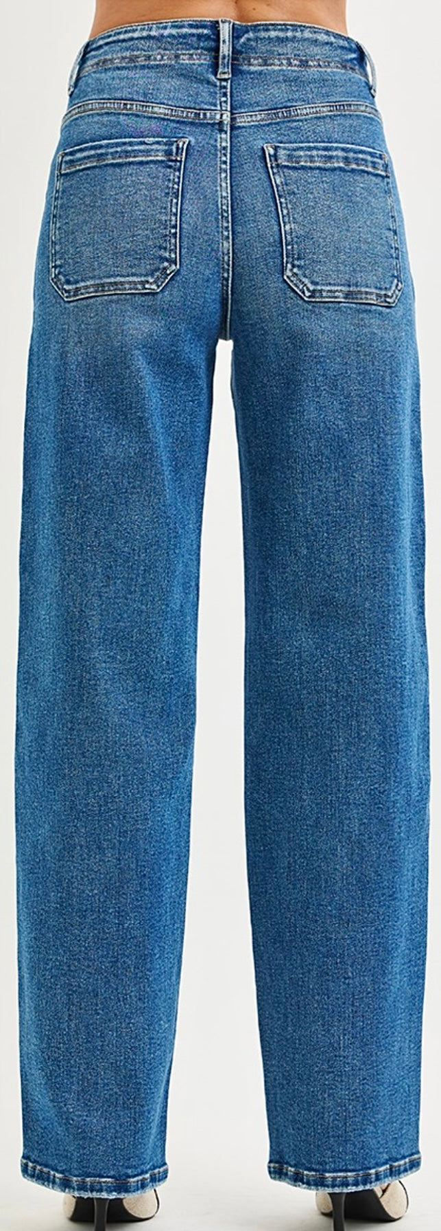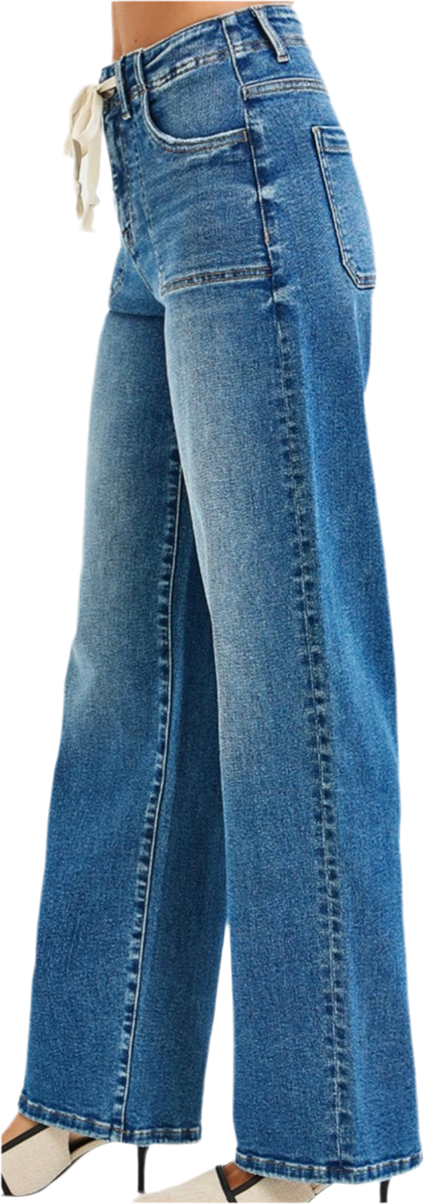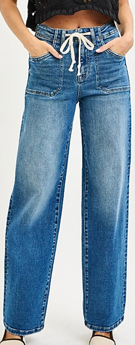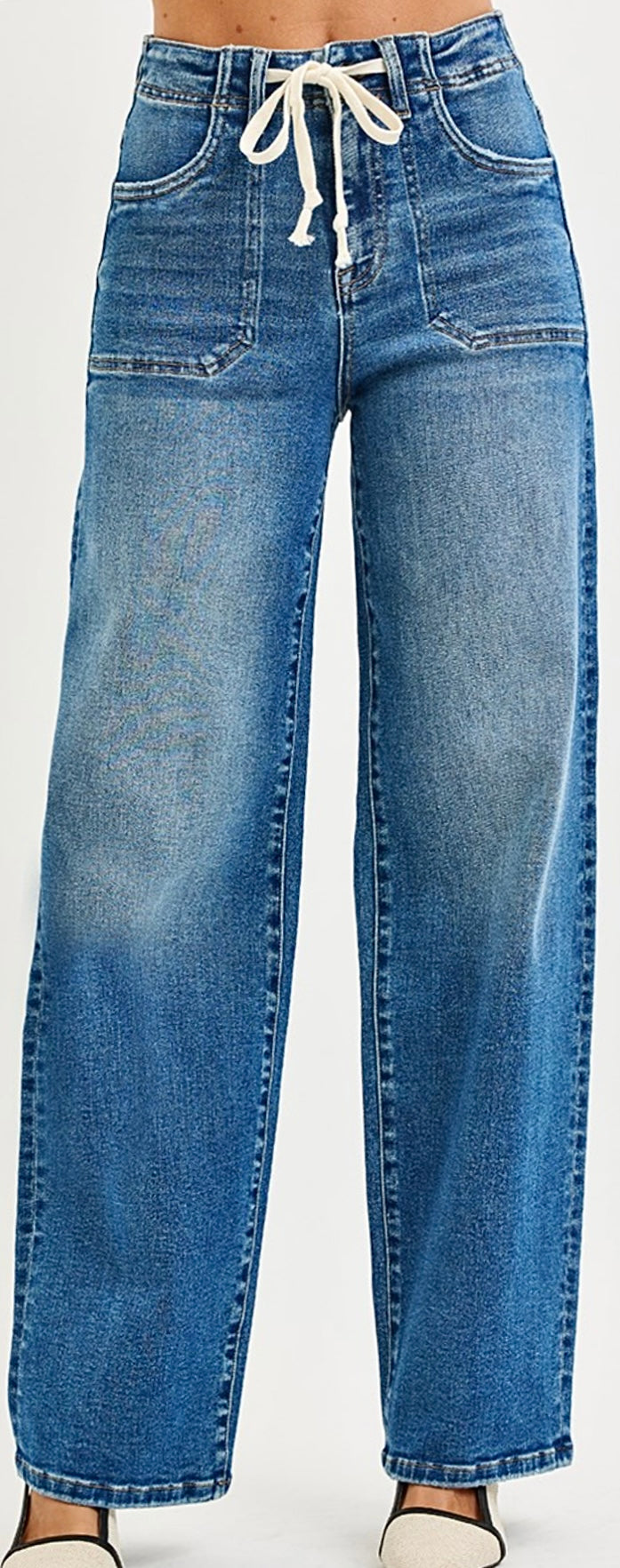 Super cute baggy denim with added stretch for comfortable perfect fit. Drawstring waist.